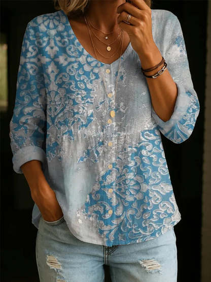 Women's Vintage Floral Pattern Art Print Casual Cotton Linen Shirt