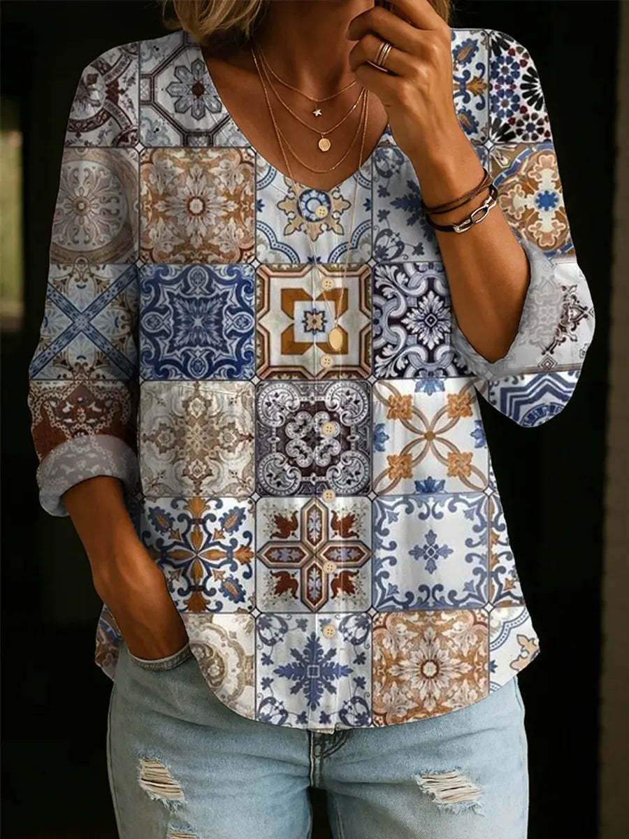 Women's Vintage Floral Pattern Art Print Casual Cotton Linen Shirt