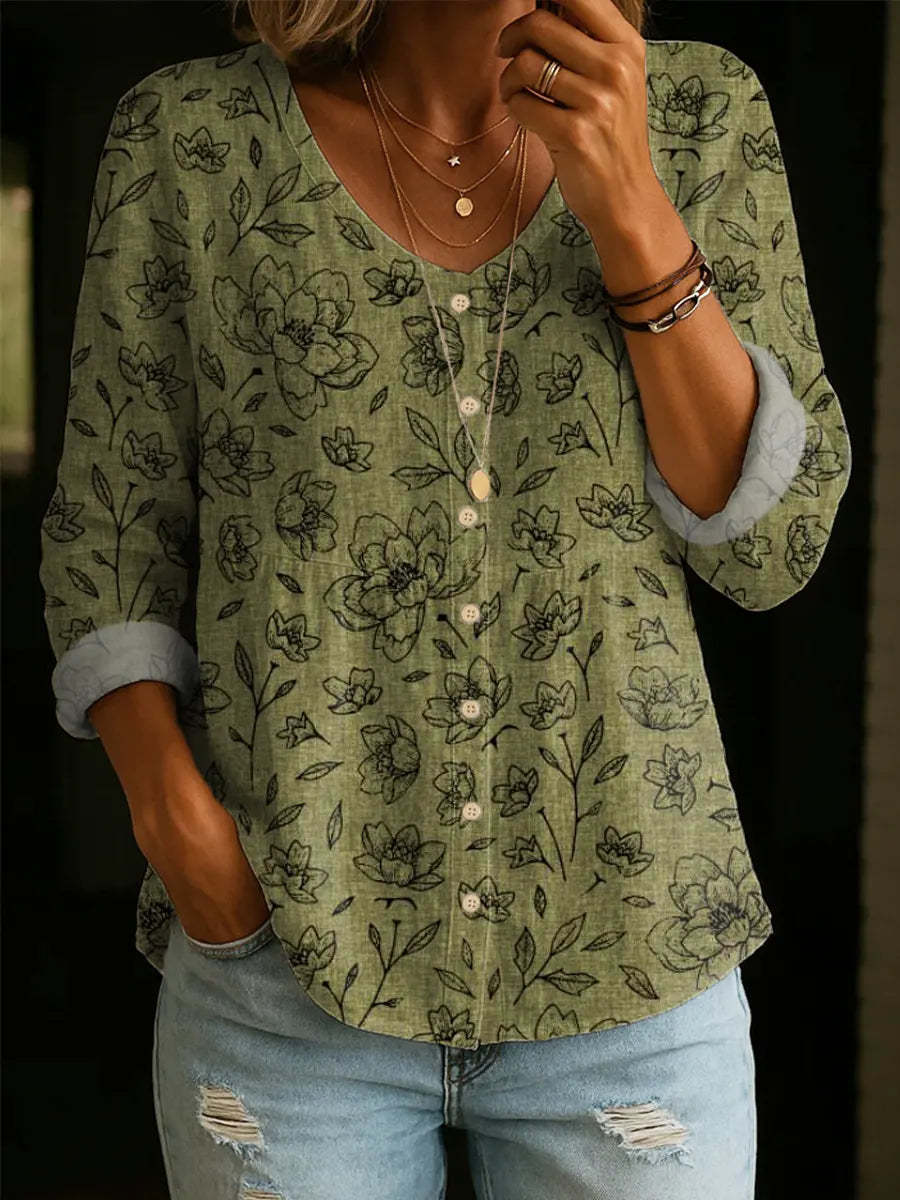 Women's Vintage Floral Pattern Art Print Casual Cotton Linen Shirt