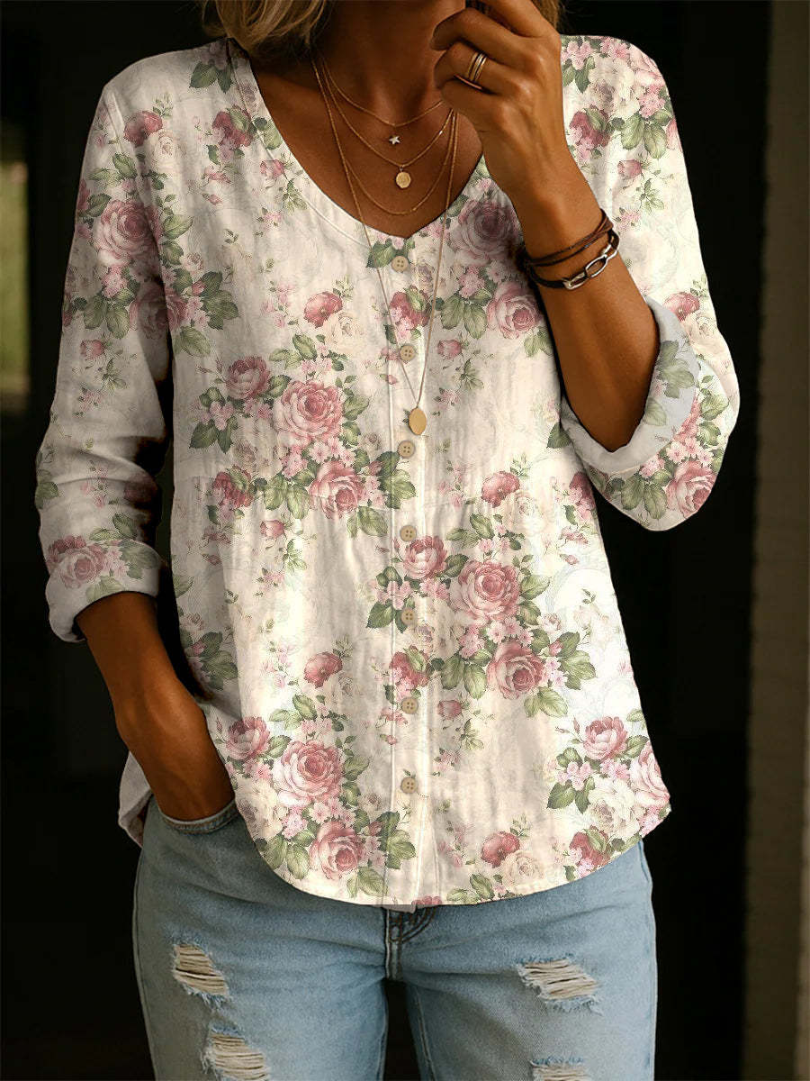 Women's Vintage Flower Pattern Art Print Casual Cotton Shirt